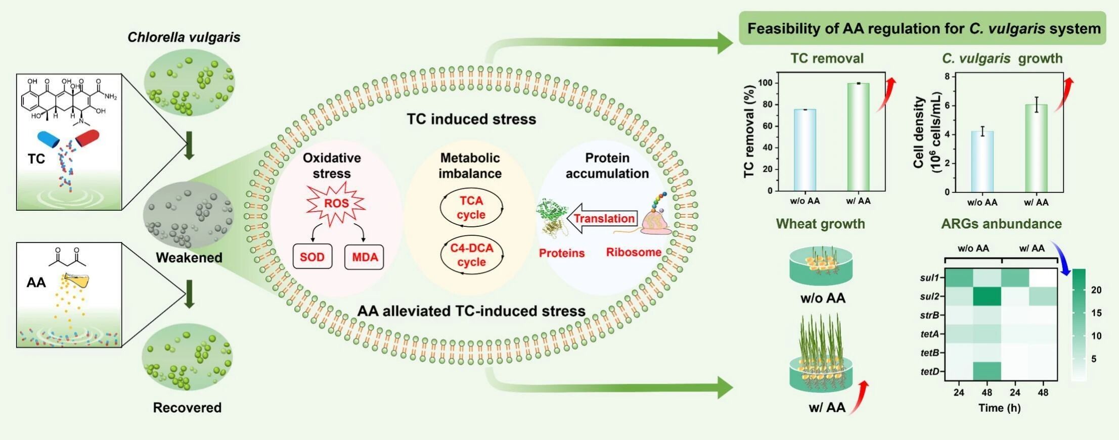 在生态安全性方面,研究评估了AA与小球藻联合处理后的出水对小麦生长发育的影响,结果显示其未产生显著毒性效应。此外,该联合处理还能有效抑制多种抗生素抗性基因(ARGs)的扩散,显示出良好的环境相容性与抗性防控潜力。