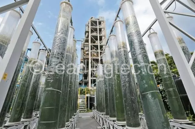 在和平厂的水泥窑旁,矗立着一根根超过一人高的绿色巨型柱状袋,正在自然光下打入二氧化碳培养,乍看下有点像科幻小说的场景。