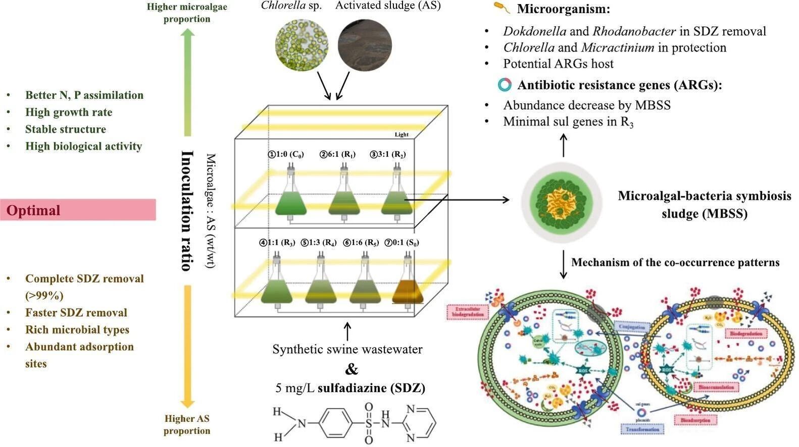 为解决这一难题,科研团队开展了专项实验,选择常见的磺胺嘧啶(SDZ)作为目标抗生素,探究不同微藻与活性污泥(含细菌)接种比例对处理效果的影响,同时通过宏基因组分析揭秘微生物群落的 “工作机制”。