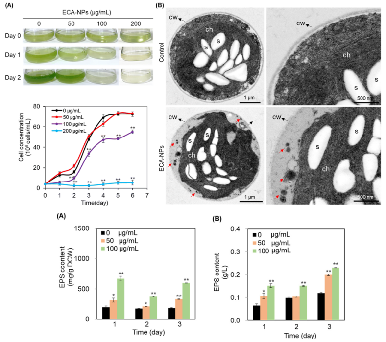 研究发现,高浓度ECA-NPs对普通小球藻的生长具有强烈抑制作用。透射电子显微镜(TEM)观察结果显示,经ECA-NPs处理后的小球藻细胞中,纳米粒子可明显内化进入细胞的周质空间与液泡内;同时,细胞出现显著形态学异常,具体表现为细胞壁变薄、类囊体结构堆叠紊乱以及质壁分离等现象,表明ECA-NPs已对小球藻细胞结构造成损伤。