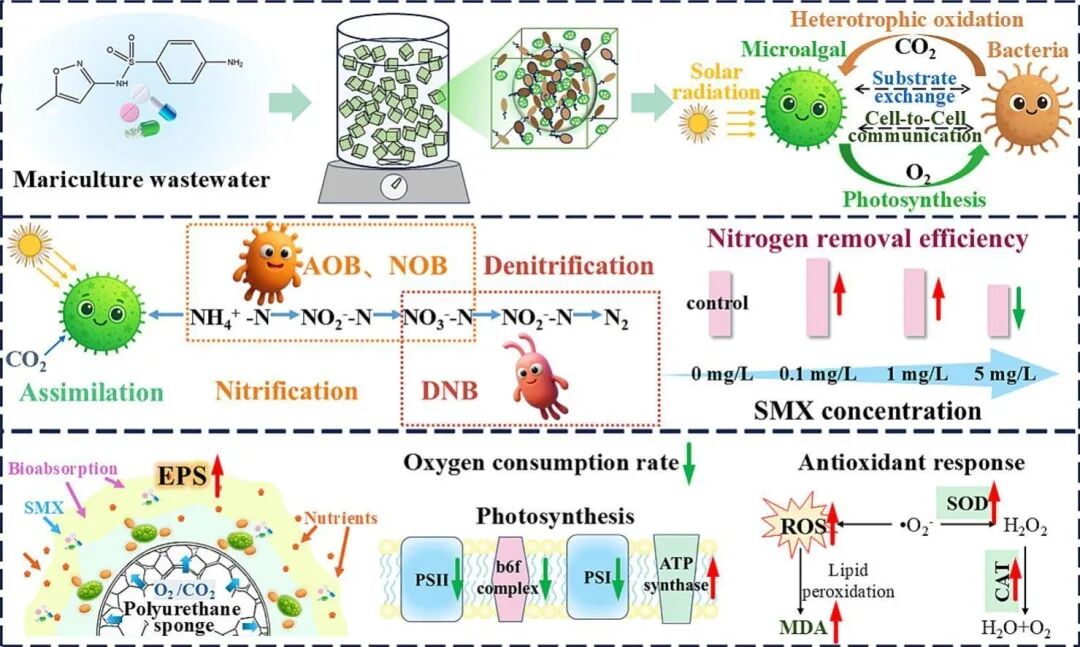 海水养殖产业的规模化发展伴随着大量含氮废水排放,而养殖过程中广泛使用的抗生素(如磺胺甲恶唑,SMX)在水体中持续累积,对传统生物处理工艺的稳定性和处理效能构成严峻挑战。微藻 – 细菌共生系统凭借其高效的脱氮能力、环境适应性强等优势,在含盐废水处理领域展现出良好应用前景,但 SMX 胁迫对该共生系统的影响规律及其潜在的微生物生理与生态响应机制尚不明确,限制了其在实际海水养殖废水处理中的工程化应用。